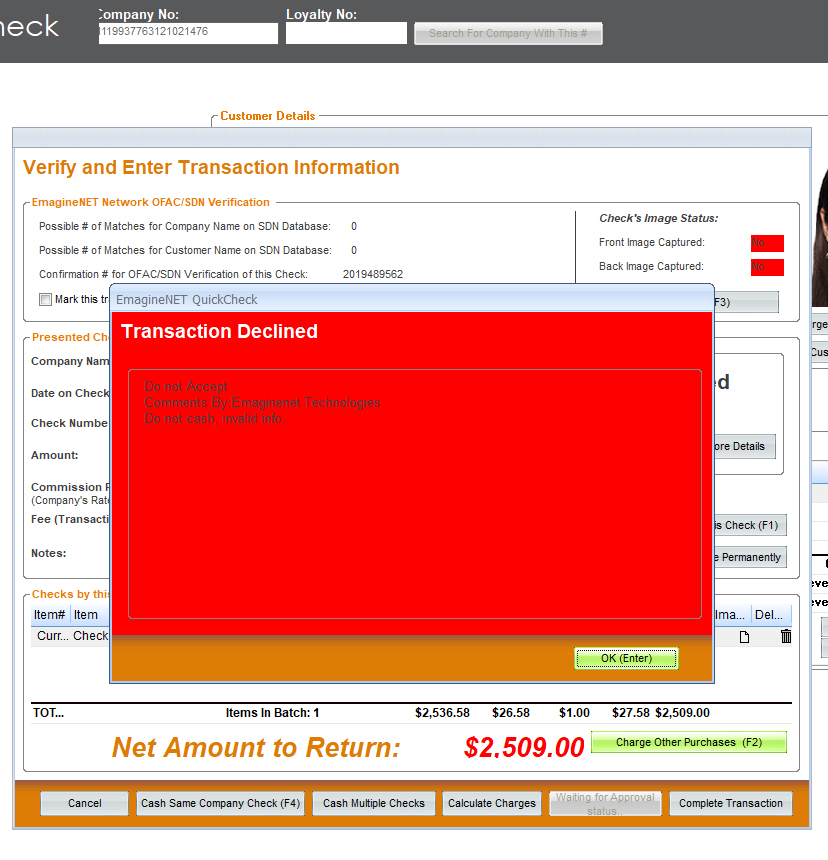 With QuickCheck's online feature get full transaction details such as check images, bank/account verification, network activity, store activity for the customer/company, plus customer picture and ID copy.